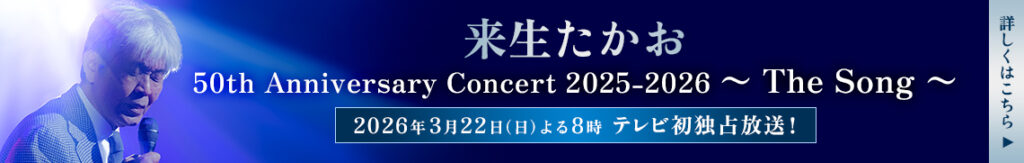 | 内容 | “来生たかお50周年記念特集”が二夜連続でCS放送「歌謡ポップスチャンネル」にてオンエアされることが決定しました。 11月26日にNHKホールで行われた50周年記念コンサートのほか、1990年に開催した「1990 CONCERT TOUR~永遠の瞬間~」、 TV初放送となるBunkamuraオーチャードホールでの40周年記念コンサート、さらに撮り下ろしインタビューで構成される「来生たかおソングブック」など、見応えたっぷりのスペシャルプログラムです。詳しくは番組HPをご覧ください。 歌謡ポップスチャンネル番組HP https://www.kayopops.jp/feature/takao_kisugi_50th/ |